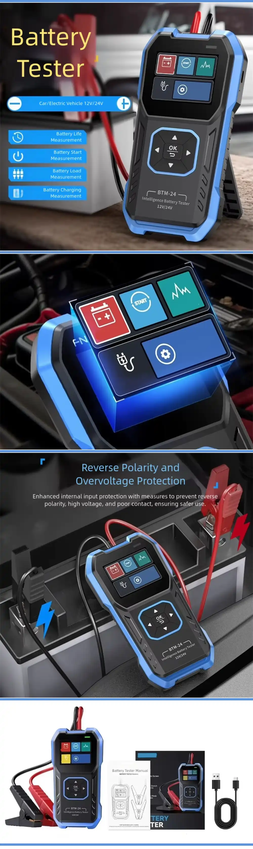 > Egy gombnyomással elindítható mérés: Pontosan méri az indítóáramot és feszültséget, az akkumulátor teljesítményének értékelése terhelés alatt, gyorsan azonosítja a gyenge vagy meghibásodott akkumulátorokat. > Valós idejű töltőrendszer-elemzés: Nyomon követi a dinamikus, minimális és maximális feszültségeket, ellenőrizve a generátor és a töltőrendszer tényleges teljesítményét változó terhelés mellett. > Fejlett biztonsági védelem: Fordított csatlakozás elleni védelem és túlfeszültség-védelem, teljesen szigetelt, túlméretezett kapcsok. > Felhasználóbarát: Meghatározza az akkumulátor élettartamát és állapotát anélkül, hogy kárt okozna. Erős, hosszú vezeték és akasztólyukat a tároláshoz és bárhol történő használathoz. Specifikációk: - Támogatott akkumulátorfeszültségek: 12 V; 24 V