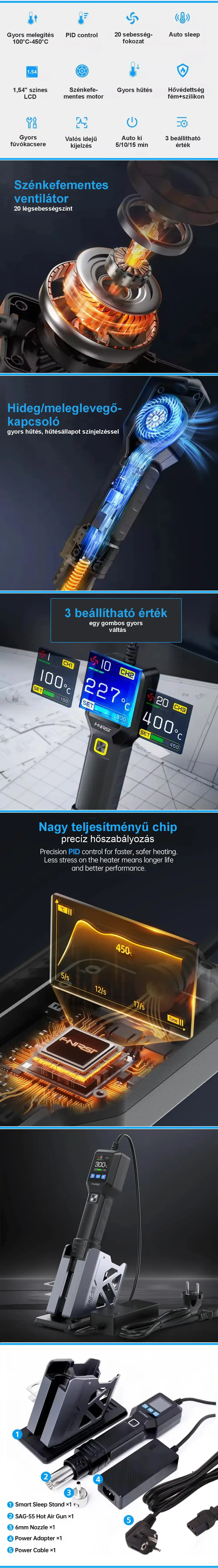 FNIRSI SAG-55 Pro - hőlégfúvó: 550 W, 100-450°C, smart állvánnyal