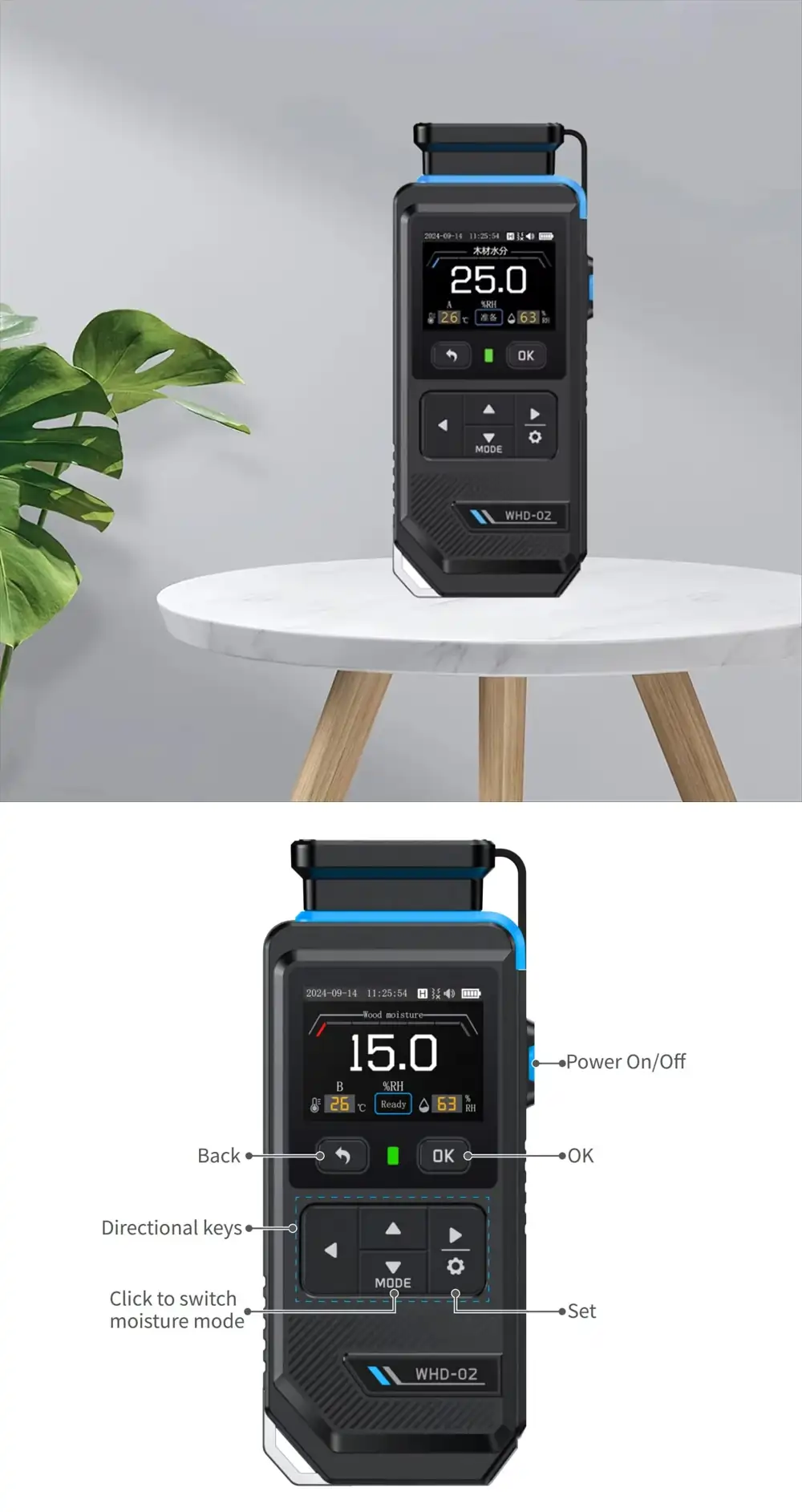Fanedvességmérő színes kijelzővel: 7 anyagkategória, adattárolás, sok beállítási lehetőség, Li-ion akkumulátor, frissíthető firmware.