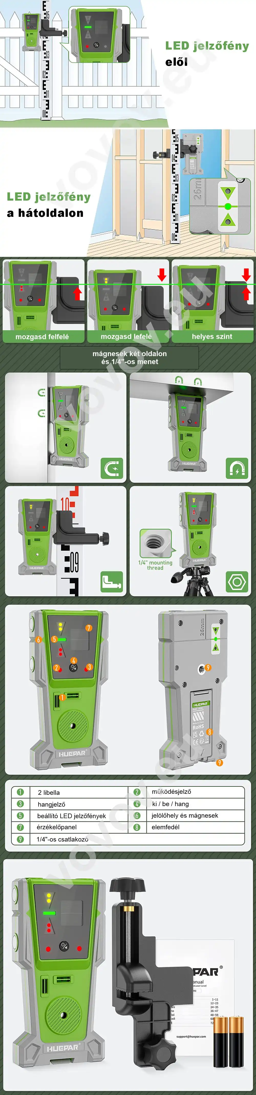 Mindennapos használatra. Csak pulzusmóddal is működő zöld és piros vonallézerekhez. Első és hátoldali LED segédfény, rögzítő mágnesek.