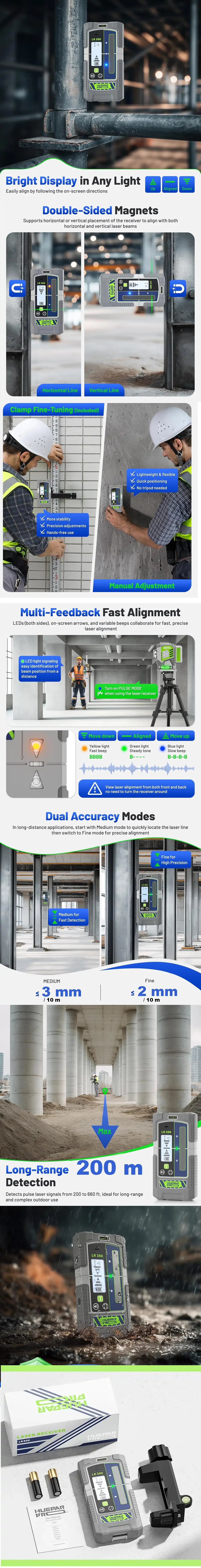 Receiver unit not compatible with rotating laser levels. Long detection range. For line lasers that operate in pulse mode only.