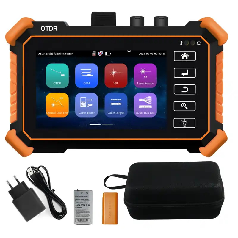 > 4 inches Intelligent and Multi-functional Fiber Optic Tester: containing expert OTDR, automatic OTDR, event map, 10G split-wave power meter, general optical power, end state verification, multi-core test, intelligent line diagnosis (optional), loss test, RJ45 line length/line sequence/seeking line, red light, stable light source, illumination. Touch screen and button double design, simple operation, friendly interface, is the optical cable construction installation, engineering acceptance and on-site repair of the right hand.