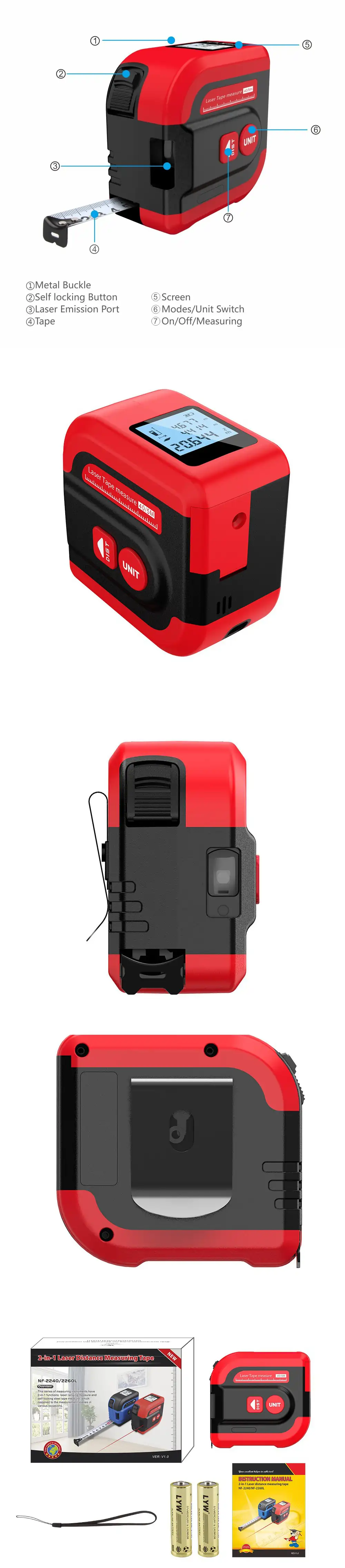 Technical indexes Model NF-2240 NF-2260L Measurement range 0.05~40 m 0.05~60 m Measurement precision ±2 mm ±2 mm Laser color red red Display type FSTN LCD screen FSTN LCD screen Unit options m/ft/in m/ft/in Benchmark setting √ √ Signal measurement √ √ Continuous measurement √ √ Area measurement √ √ Volume measurement √ √ Pythagorean measurement × × Beep √ √ Voice function × √ Tape measurement range 5 m 5 m Laser auto-off 30s 30s Auto-off time 2 mins 2 mins Power supply AAA*2*1.5V Lithium battery Working temperature 0℃~40℃ 0℃~40℃ Storage temperature -10℃~60℃ -10℃~60℃ Protection leve IP54 IP54 Dimension 80*42*78 mm 80*42*78 mm Weight 240 g 260 g Package dimension 15x11x7 mm 15x11x7 mm Package weight 420 g 440 g