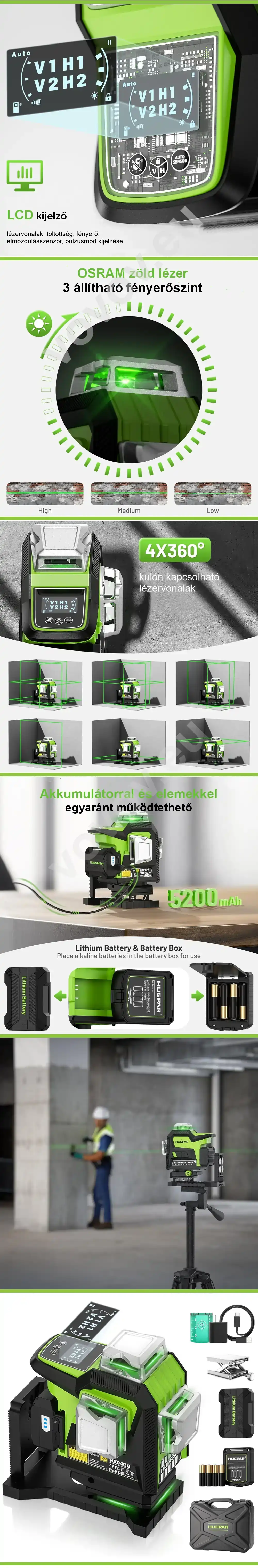 Huepar HX04CG - 16 vonalas, 4D (4x360°) zöld szintező lézer